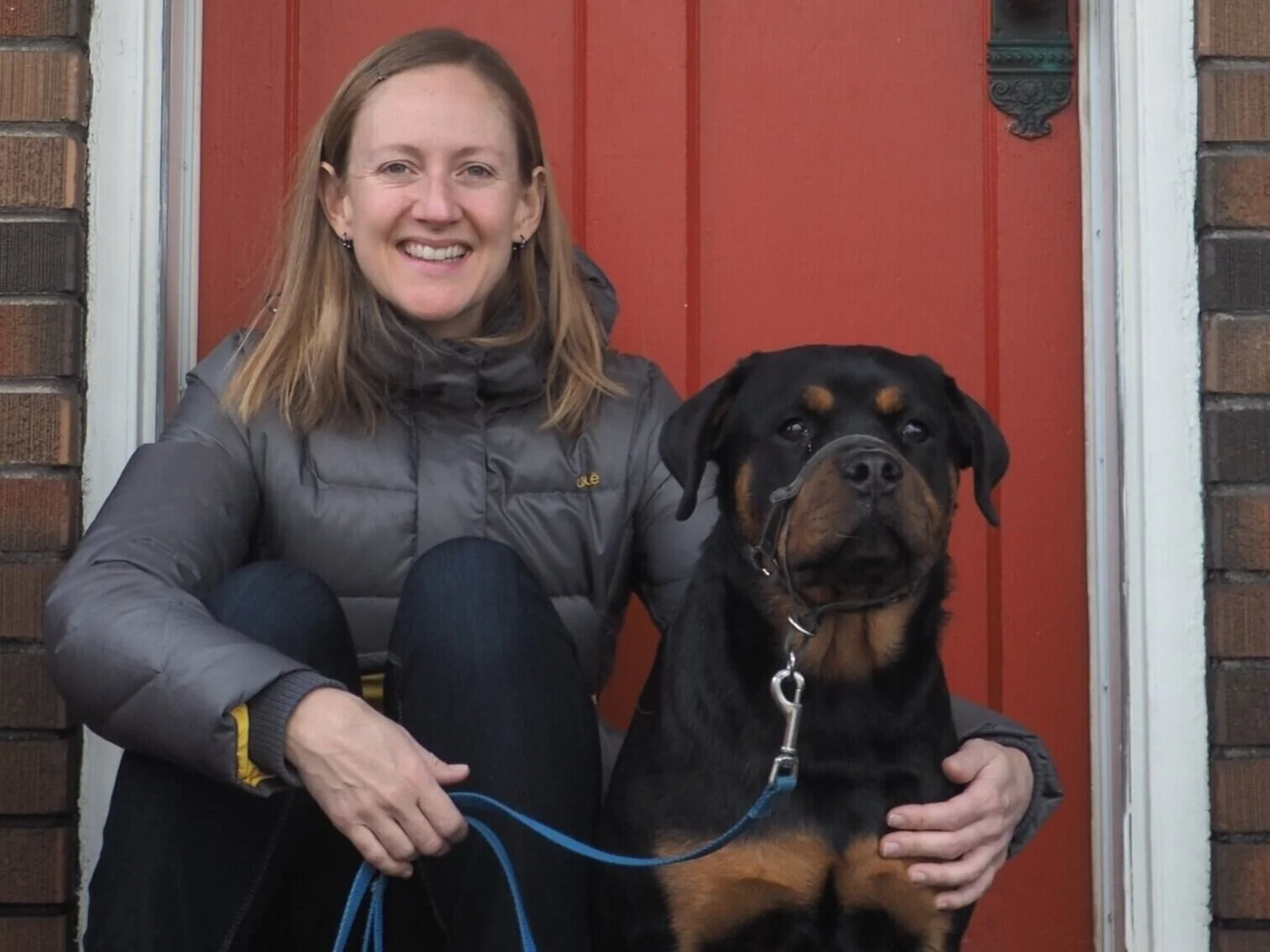 Alyssa Foulkes and Magic the Rottweiler sitting in front of a red door
